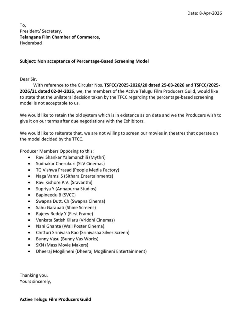 తెలుగు చిత్ర పరిశ్రమలో మరో కొత్త వివాదం రాజుకుంది. థియేటర్లలో సినిమాల ప్రదర్శనకు సంబంధించి తెలంగాణ ఫిల్మ్ ఛాంబర్ ఆఫ్ కామర్స్ (TFCC) ఇటీవల ప్రతిపాదించిన “పర్సంటేజ్ ఆధారిత స్క్రీనింగ్ మోడల్”పై అగ్ర నిర్మాతలు తీవ్ర అభ్యంతరం వ్యక్తం చేశారు. ఈ విధానాన్ని ఏకపక్షంగా తమపై రుద్దడాన్ని అంగీకరించబోమని స్పష్టం చేస్తూ, యాక్టివ్ తెలుగు ఫిల్మ్ ప్రొడ్యూసర్స్ గిల్డ్ (ATFPG) ఏప్రిల్ 8న ఛాంబర్కు ఓ అధికారిక లేఖ రాసింది.